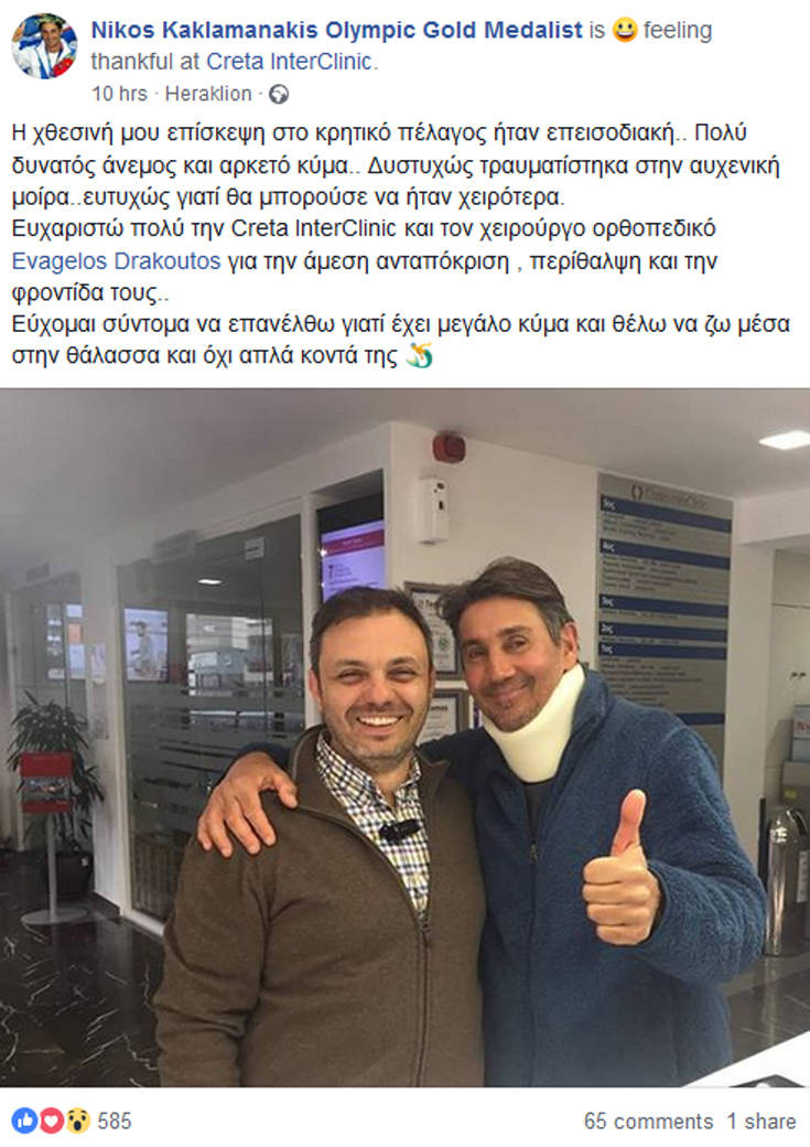 «Η χθεσινή μου επίσκεψη στο κρητικό πέλαγος ήταν επεισοδιακή. Πολύ δυνατός άνεμος και αρκετό κύμα. Δυστυχώς τραυματίστηκα στην αυχενική μοίρα ευτυχώς γιατί θα μπορούσε να ήταν χειρότερα. Ευχαριστώ πολύ την Creta InterClinic και τον χειρούργο ορθοπεδικό Evagelos Drakoutos για την άμεση ανταπόκριση, περίθαλψη και την φροντίδα τους. Εύχομαι σύντομα να επανέλθω γιατί έχει μεγάλο κύμα και θέλω να ζω μέσα στην θάλασσα και όχι απλά κοντά της»