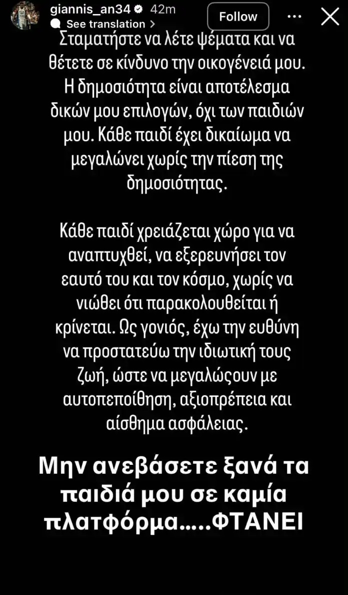 Ο σούπερ σταρ των Μιλγουόκι Μπακς ανέβασε ένα οργισμένο story στο instagram απαιτώντας από τα ΜΜΕ να μην ασχολούνται με τα παιδιά του και να μην τα ανεβάζουν στα social media, αλλά και να σταματήσουν τα ψέματα που θέτουν σε κίνδυνο την οικογένειά του.