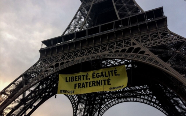 Γαλλία: Κρέμασαν πανό κατά της Λεπέν στον Πύργο του Άιφελ Μέλη της Greenpeace τοποθέτησαν το πανό με τις λέξεις «Liberté, Egalité, Fraternité»