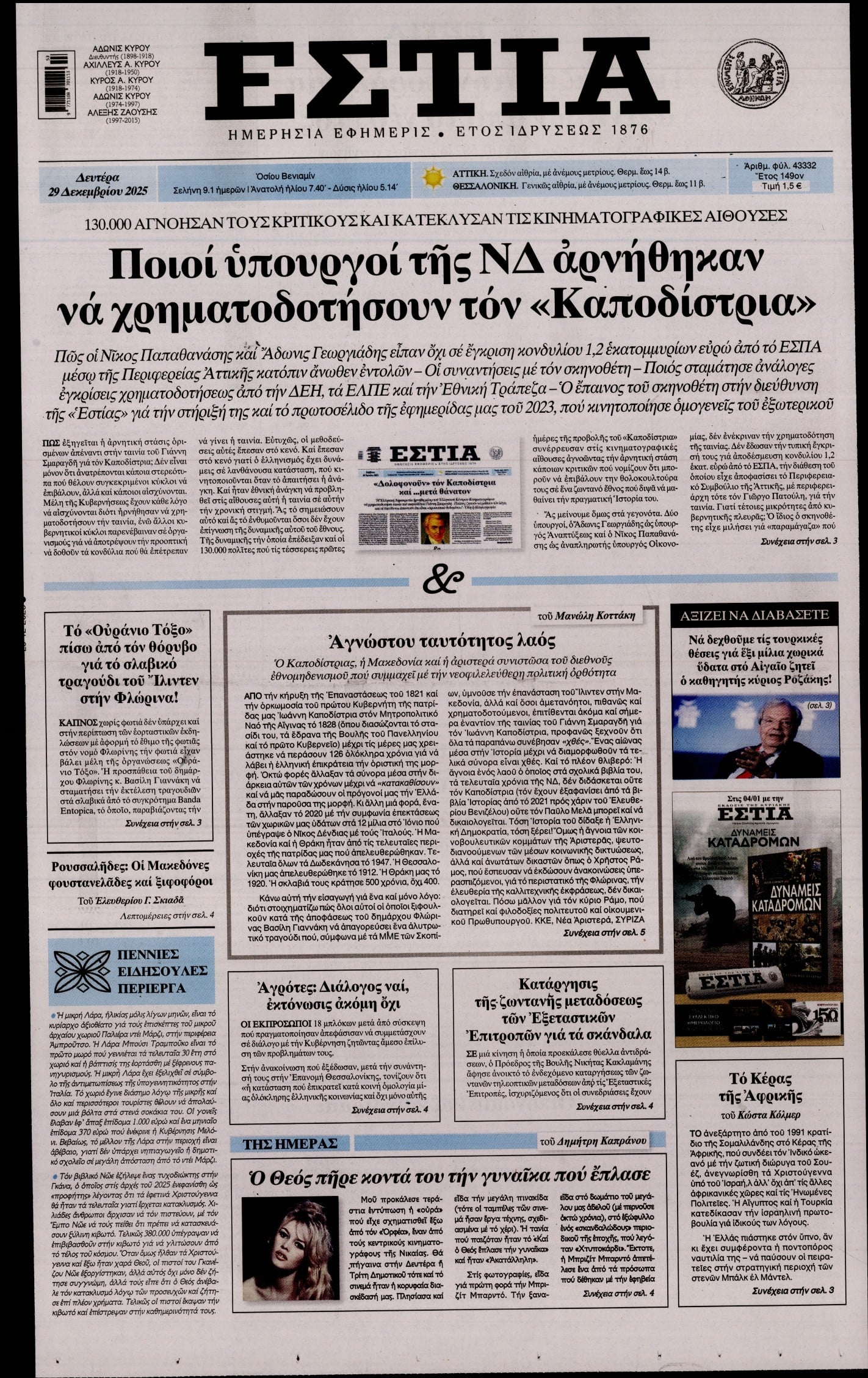 Δευτέρα 29 Δεκεμβρίου 2025