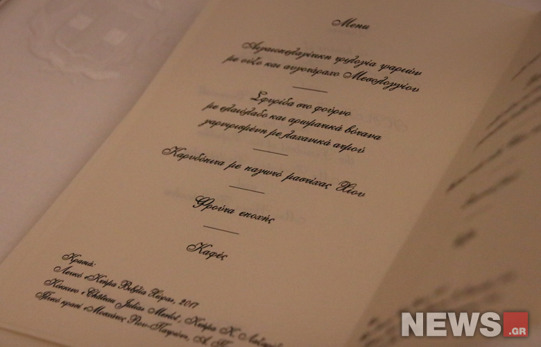 Παραδοσιακές ελληνικές γεύσεις περιλαμβάνει το μενού του επίσημου δείπνου προς τιμήν του πρίγκιπα Κάρολου και της συζύγου του, Καμίλα, στο Προεδρικό Μέγαρο, με το οποίο ολοκληρώνεται το πρόγραμμα της πρώτης ημέρας στην Αθήνα του πριγκιπικού ζεύγους της Βρετανίας στην Αθήνα.