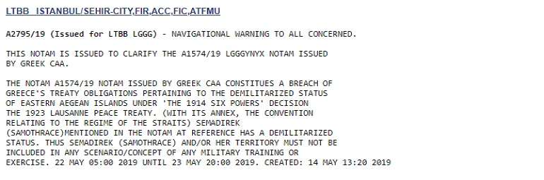 Παράλληλα δε οι Τούρκοι επαναφέρουν με άλλη ΝΟΤΑΜ το θέμα της αποστρατιοκωποίησης των νησιών του Ανατολικού Αιγαίου, αρνούμενοι το δικαίωμα της Ελλάδας να διεξάγει άσκηση στη Σαμοθράκη.