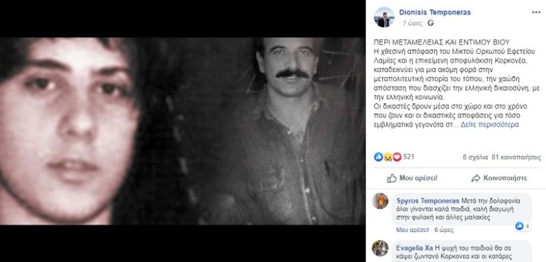 Για «μια άκρως πολιτική απόφαση» και για «χαώδη απόσταση που διασχίζει την ελληνική δικαιοσύνη, με την ελληνική κοινωνία», κάνει λόγο σε ανάρτησή του στον προσωπικό του λογαριασμό στο Facebook ο γιος του δολοφονημένου καθηγητή Νίκου Τεμπονέρα, Διονύσης, σχολιάζοντας την δικαστική απόφαση με την οποία αποφυλακίστηκε ο Επαμεινώνδας Κορκονέας.