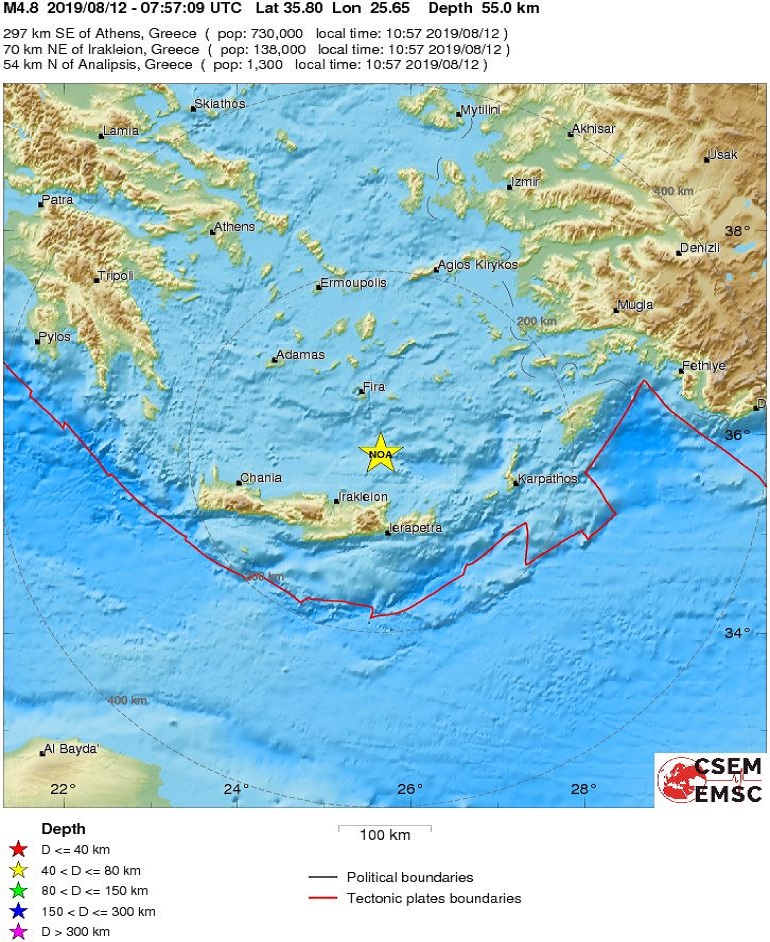 Σεισμός 4,8 βαθμών της κλίμακας Ρίχτερ 70 χιλιόμετρα Βορειοανατολικά του Ηρακλείου στην Κρήτη με εστιακό βάθος στα 55 χιλιόμετρα σύμφωνα με το Ευρωμεσογειακό Σεισμογραφικό Κέντρο.