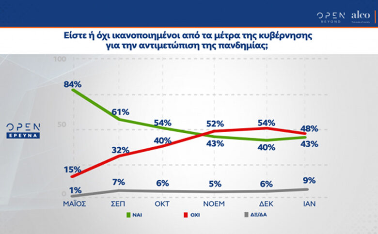 Τέλος, στο ερώτημα για το αν είναι ικανοποιημένοι ή όχι από τα μέτρα της κυβέρνησης για την αντιμετώπιση της πανδημίας, το 48% απαντά αρνητικά, το 43% θετικά και το 9% δεν απαντά.