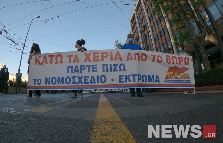Οι συγκεντρωμένοι διαμαρτύρονται για το νομοσχέδιο του υπουργείου Εργασίας και ζητούν την απόσυρσή του, όπως και τη μη κατάργηση του 8ώρου.