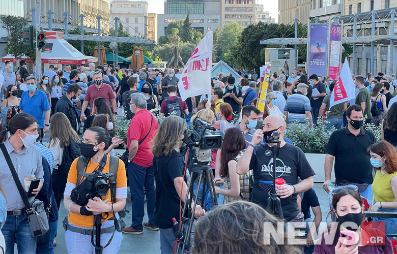 Πολύς κόσμος βρίσκεται στα Προπύλαια και επί της πλατείας Κάνιγγος, ενώ το παρών στη συγκέντρωση δίνει και ο Γενικός Γραμματέας του ΚΚΕ, Δημήτρης Κουτσούμπας.