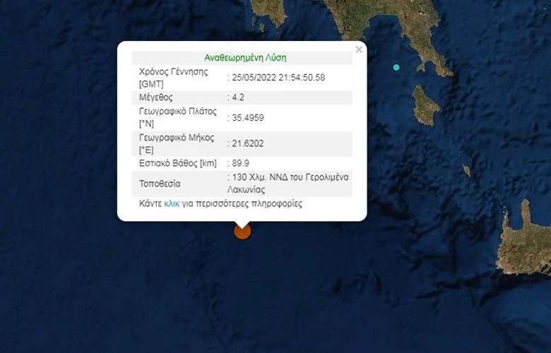 Συγκεκριμένα, έγινε 132 χιλιόμετρα νότια-νοτιοδυτικά του οικισμού Γερολιμένα Λακωνίας, ή 335 χλμ. νοτιοδυτικά της Αθήνας, ανακοίνωσε το Γεωδυναμικό Ινστιτούτο του Εθνικού Αστεροσκοπείου Αθηνών.