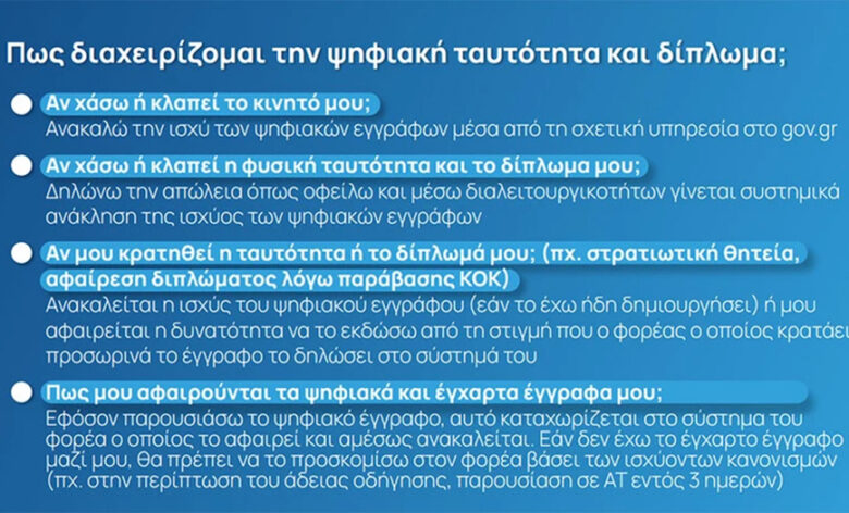 Εάν ο πολίτης δηλώσει την απώλεια της αστυνομικής του ταυτότητας είτε αυτοπροσώπως σε ένα Αστυνομικό Τμήμα είτε μέσω του gov.gr, τότε αυτόματα και άμεσα οποιοδήποτε ψηφιακό αντίγραφο έχει εκδοθεί ακυρώνεται. Το ίδιο ισχύει και εάν ο πολίτης δηλώσει την απώλεια του διπλώματος οδήγησης σε ένα Αστυνομικό Τμήμα, σε ένα ΚΕΠ ή στη Διεύθυνση Μεταφορών της αρμόδιας Περιφέρειας.