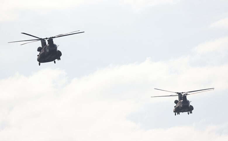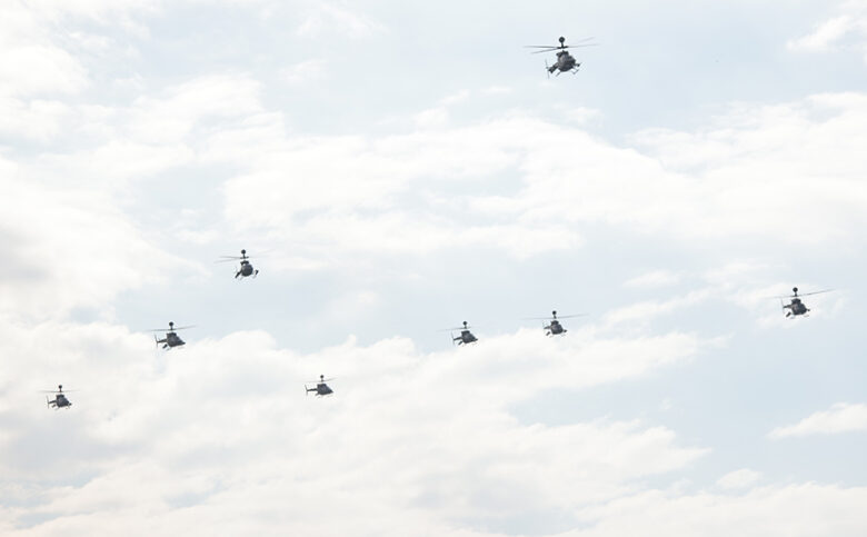 Τα μαχητικά αεροσκάφη σηκώθηκαν από την 114 Πτέρυγα Μάχης στην Τανάγρα και πέταξαν σε σχηματισμούς με επιθετικά ελικόπτερα, ελικόπτερα αναγνώρισης, ναυτικών επιχειρήσεων, ανθυποβρυχιακού πολέμου και μεταφορικά ελικόπτερα.