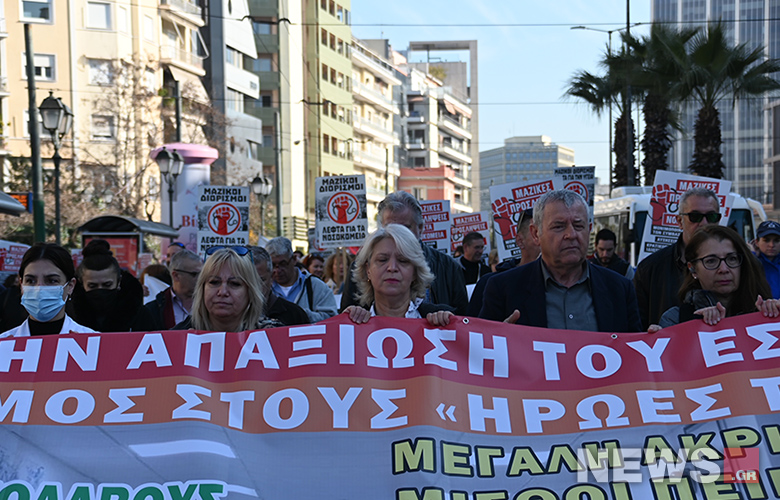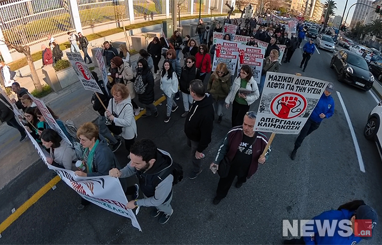 Η συγκέντρωση ξεκίνησε από την πλατεία Μαβίλη και ακολουθεί πορεία προς το Μέγαρο Μαξίμου, τη Βουλή και το υπουργείο Υγείας.