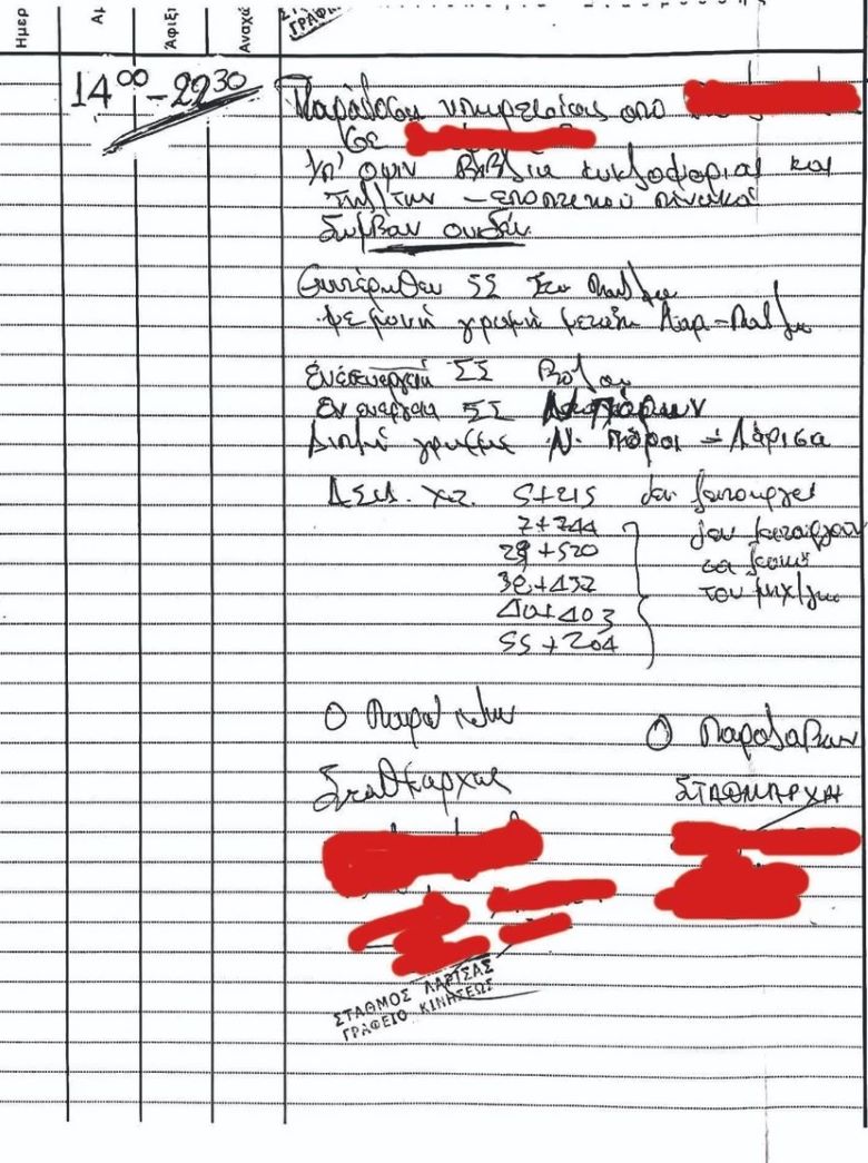 Αποκάλυψη για τη σελίδα από το βιβλίο παράδοσης-παραλαβής που τηρείται στο σταθμαρχείο της Λάρισας