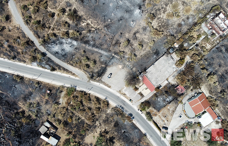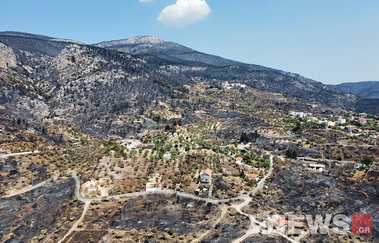 Καμένα δέντρα και σπίτια ανάμεσα στο λιγοστό πια πράσινο