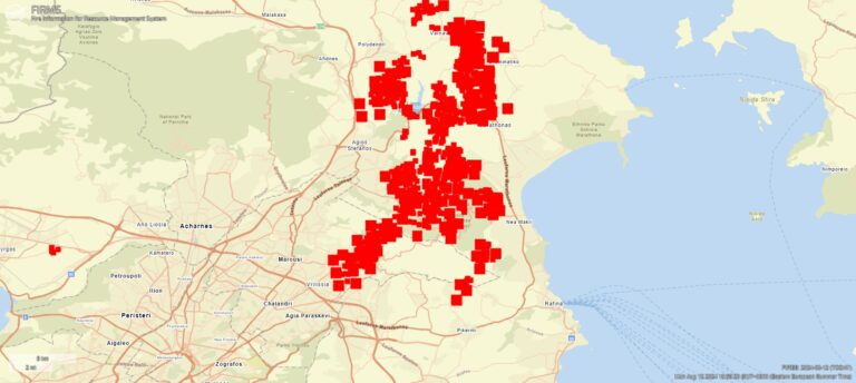 Επιπλέον, δορυφορικές παρατηρήσεις υψηλής ανάλυσης (375 m) από το σύστημα FIRMS (Fire Information for Resource Management System) της NASA δείχνουν τα θερμά σημεία που ανιχνεύθηκαν από δορυφόρους πολικής τροχιάς κατά τις πρώτες πρωινές ώρες (03:00, Εικόνα 1) και το μεσημέρι (13:00, Εικόνα 2) της Δευτέρας 12ης Αυγούστου 2024.