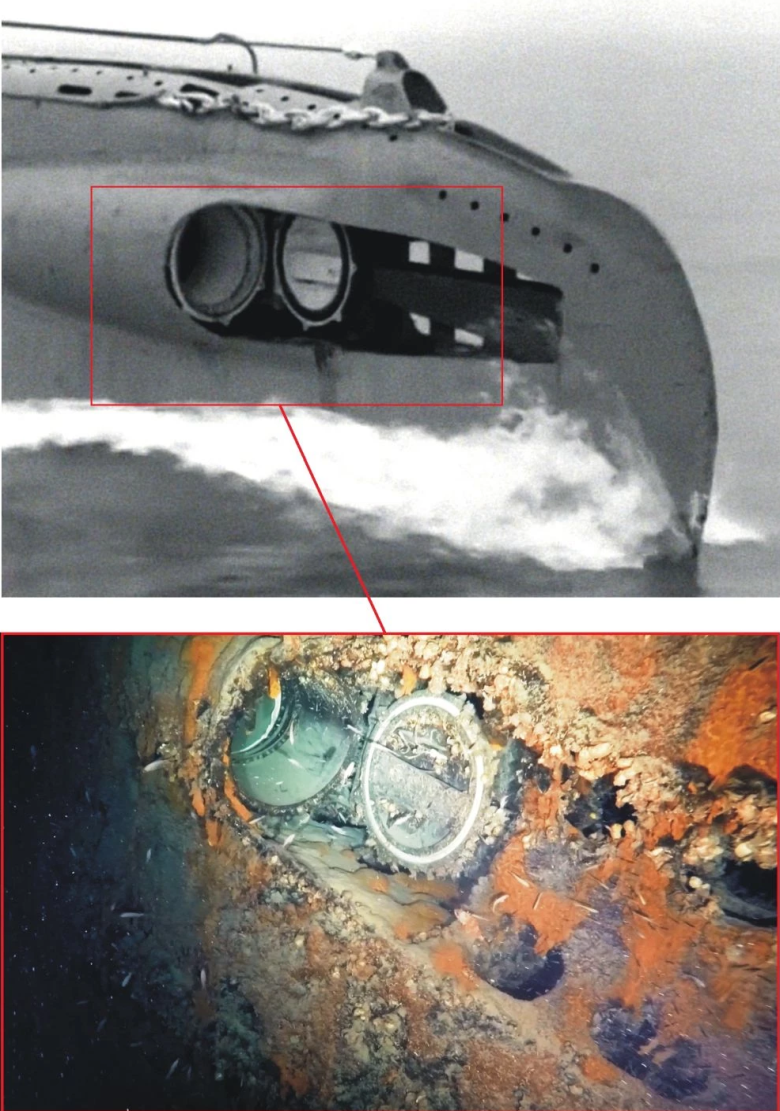 Η πλώρη και η πρύμνη κείτονται στο βυθό σε κοντινή απόσταση, ενώ ο πυργίσκος του υποβρυχίου έχει αποσπαστεί και βρίσκεται αρκετά πιο μακριά. Το σκηνικό είναι απόκοσμο...