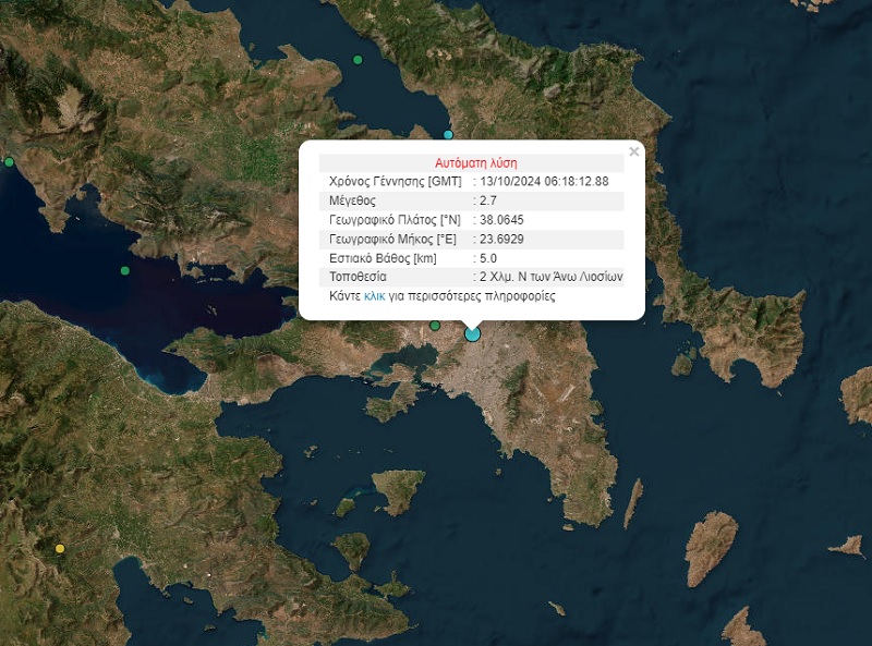 Σύμφωνα με την αυτόματη λύση του Γεωδυναμικού Ινστιτούτου Αθηνών, η ένταση του σεισμοί ήταν 2,7 Ρίχτερ και το επίκεντρο του εντοπίζεται 2 χλμ. νότια των Άνω Λιοσίων.
