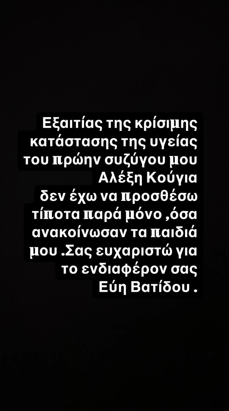 Η πρώην σύζυγός του και μητέρα των παιδιών του Εύη Βατίδου, μέσω των stories του Instagram εξέδωσε μια ανακοίνωση.