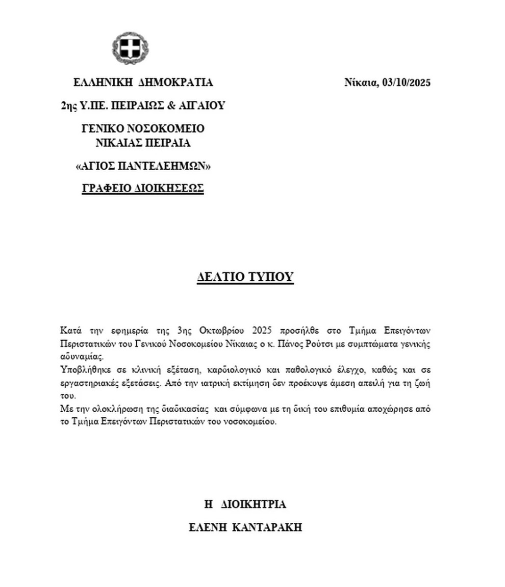 «Κατά την εφημερία της 3ης Οκτωβρίου 2025 προσήλθε στο Τμήμα Επειγόντων Περιστατικών του Γενικού Νοσοκομείου Νίκαιας ο κ. Πάνος Ρούτσι με συμπτώματα γενικής αδυναμίας.