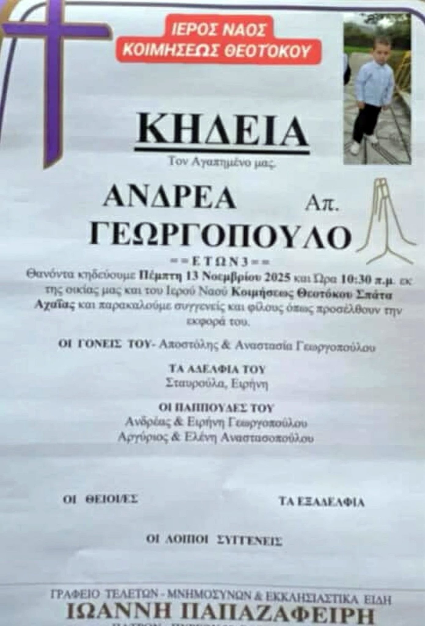 Η κηδεία του παιδιού θα γίνει αύριο (13/11) το πρωί, στις 10:30, στον Ιερό Ναό Κοιμήσεως Θεοτόκου στα Σπάτα Αχαΐας.