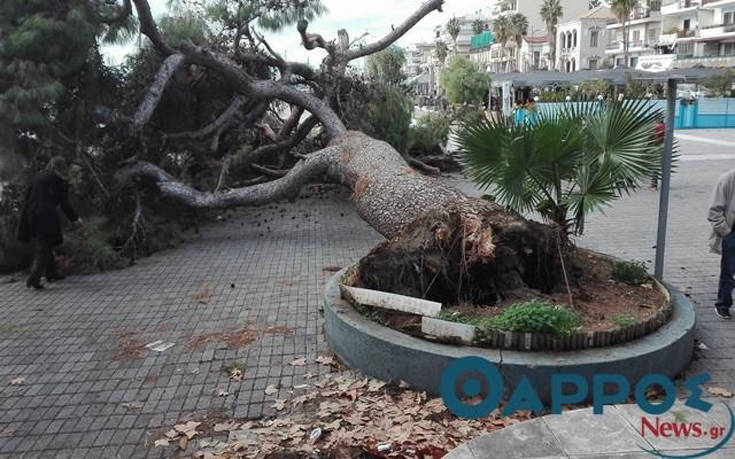 Σωριασμένο στο έδαφος αντίκρισαν το πρωί της Κυριακής περαστικοί και κάτοικοι της παραλίας το υπεραιωνόβιο πεύκο που δέσποζε στο «Πανελλήνιον» στο λιμάνι της Καλαμάτας.