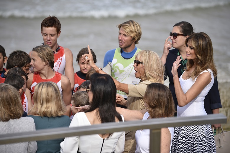 Η πρώτη κυρία της Γαλλίας, η Μελάνια Τραμπ, η Άκιε Άμπε (σύζυγος του Ιάπωνα πρωθυπουργού Σίνζο Άμπε) η Σεσίλια Μορέλ (σύζυγος του προέδρου της Χιλής Σεμπαστιάν Πινιέρα) η Τζένι Μόρισον (σύζυγος του Αυστραλού πρωθυπουργού Σκοτ Μόρισον) καθώς και οι σύζυγοι του Ντόναλντ Τουσκ, του προέδρου του Ευρωπαϊκού Συμβουλίου και του Ντέιβιντ Μάλπας, προέδρου της Παγκόσμιας Τράπεζας, συναντήθηκαν με δύο πρωταθλητές του σερφ.