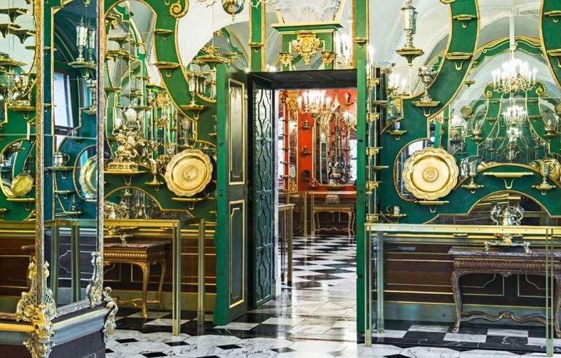 Ανάμεσα στα άλλα εκθέματα στη Δρέσδη περιλαμβάνεται ένα μεγέθους τραπεζιού γλυπτό ινδικής βασιλικής αυλής του 18ου αιώνα φτιαγμένο από χρυσό, ασήμι, σμάλτο, πολύτιμους λίθους και μαργαριτάρια. Ένα άλλο είναι ένα χρυσό σερβίτσιο του καφέ φιλοτεχνημένο το 1701 από τον κοσμηματοποιό της αυλής Μέλχιορ Ντινγκλίνγκερ, διακοσμημένο με νωχελικά χερουβείμ.