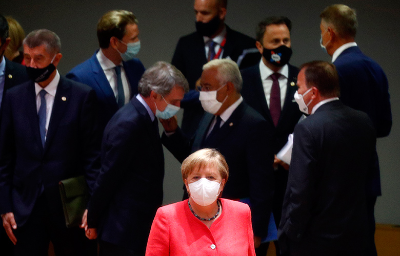 Καθισμένοι σε απόσταση ο ένας από τον άλλο, 24 άνδρες και 5 γυναίκες που φορούν μάσκες, αυτό είναι το σκηνικό της Συνόδου ηγετών της Ευρωπαϊκής Ένωσης, στις Βρυξέλλες, την εποχή του νέου κοροναϊού.