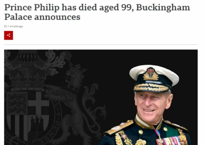 Το BBC μετέδωσε την είδηση γράφοντας: «Ο πρίγκιπας Φίλιππος πέθανε στα 99 του χρόνια, ανακοίνωσε το Μπάκιγχαμ».