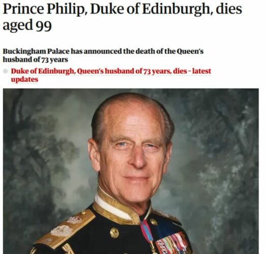 Η Guardian αναφέρει: «Ο πρίγκιπας Φίλιππος, Δούκας του Εδιμβούργου, πέθανε στα 99 του χρόνια».