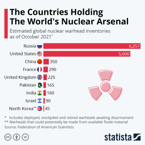 Σύμφωνα με τα επίσημα στοιχεία της Statista (για το 2021), η Ρωσία και oι ΗΠΑ φαίνεται να κατέχουν τη μερίδα του λέοντος με 6.257 και 5.600 στις πυρηνικές κεφαλές, αντιστοίχως. Για την ακρίβεια, κατέχουν περισσότερο από το 90% των πυρηνικών κεφαλών στον κόσμο.