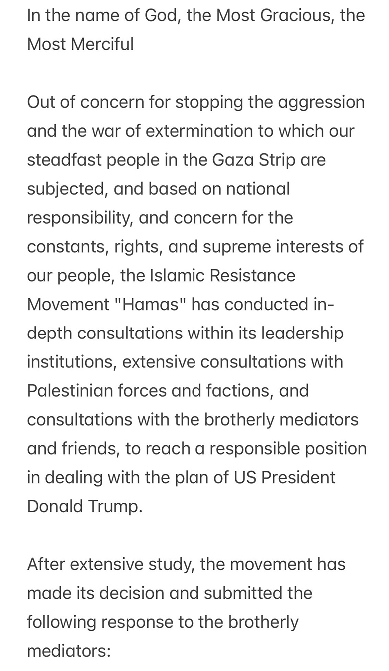 Με γνώμονα την ανάγκη να σταματήσει η επιθετικότητα και ο πόλεμος εξόντωσης στον οποίο υποβάλλεται ο σταθερός λαός μας στη Λωρίδα της Γάζας, και βασιζόμενη στην εθνική ευθύνη και την υπεράσπιση των θεμελιωδών δικαιωμάτων και των ύψιστων συμφερόντων του λαού μας, το Ισλαμικό Κίνημα Αντίστασης «Χαμάς» διεξήγαγε εις βάθος διαβουλεύσεις με τους ηγετικούς της θεσμούς, εκτενείς συζητήσεις με παλαιστινιακές δυνάμεις και παρατάξεις, καθώς και με αδελφούς μεσολαβητές και φίλους, προκειμένου να διαμορφώσει μια υπεύθυνη στάση απέναντι στο σχέδιο του Προέδρου των ΗΠΑ Ντόναλντ Τραμπ.