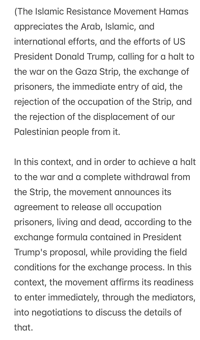 Το Ισλαμικό Κίνημα Αντίστασης Χαμάς εκφράζει την εκτίμησή του προς τις αραβικές, ισλαμικές και διεθνείς προσπάθειες —καθώς και προς τις προσπάθειες του Αμερικανού Προέδρου Ντόναλντ Τραμπ— για την επίτευξη: