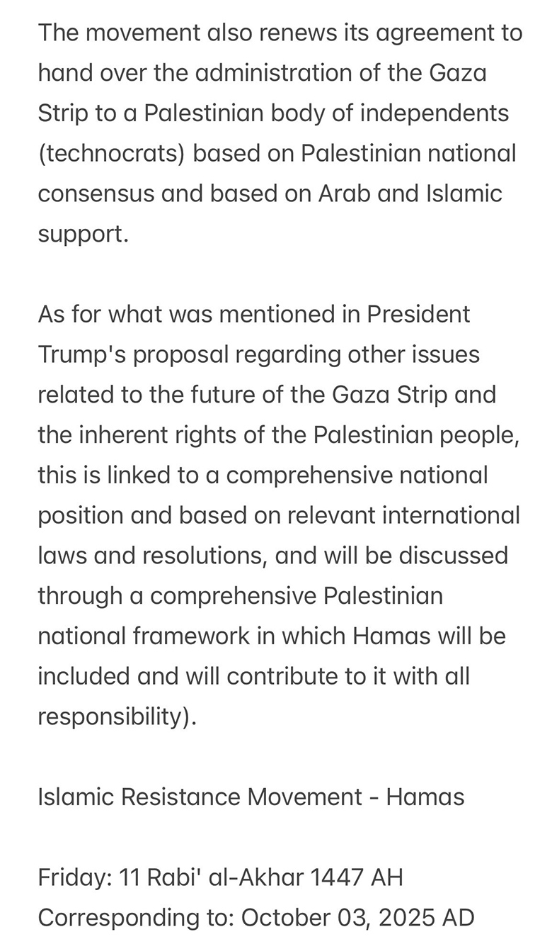 Όσον αφορά τα σημεία της πρότασης του Προέδρου Τραμπ που σχετίζονται με άλλα ζητήματα για το μέλλον της Λωρίδας της Γάζας και τα έμφυτα δικαιώματα του παλαιστινιακού λαού, αυτά συνδέονται με μια συνολική εθνική θέση βασισμένη στο διεθνές δίκαιο και τα σχετικά ψηφίσματα του ΟΗΕ. Αυτά τα ζητήματα θα εξεταστούν στο πλαίσιο ενός ευρύτερου παλαιστινιακού εθνικού σχεδιασμού, στον οποίο η Χαμάς θα συμμετάσχει με πλήρη υπευθυνότητα.