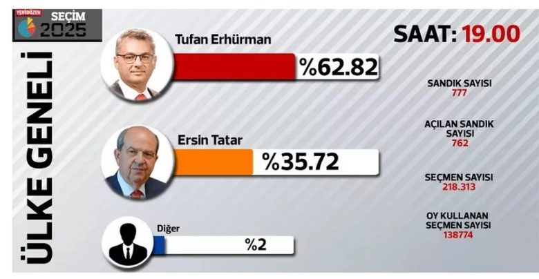 Ο Τουφάν Ερχιουρμάν λαμβάνει ποσοστό 62,76% και ο Ερσίν Τατάρ 35,80%.