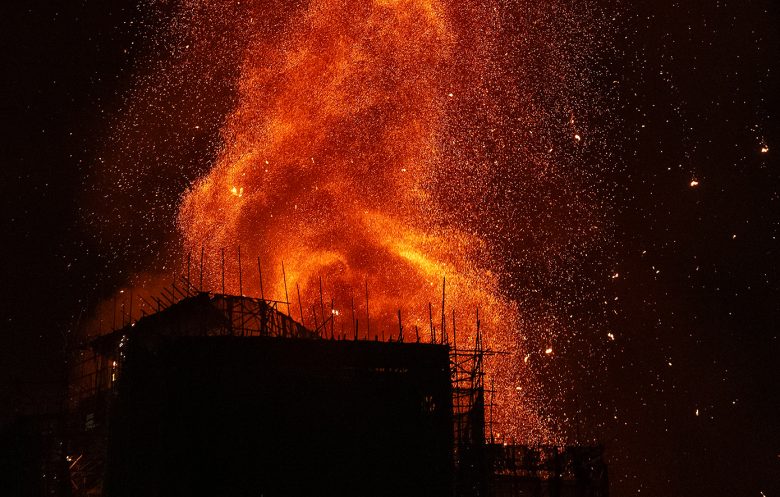 Αρκετοί ουρανοξύστες γύρω από το φλεγόμενο κτίριο έχουν μπαμπού σκαλωσιές στο εξωτερικό τους.
