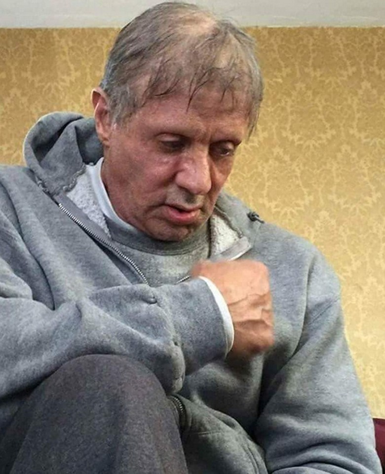 Φορώντας γκρι φόρμα, καταβεβλημένος και με ελάχιστα μαλλιά, ο κινηματογραφικός «Ρόκι» δεν θύμιζε σε τίποτα τον δυναμικό ήρωα των ταινιών δράσης.