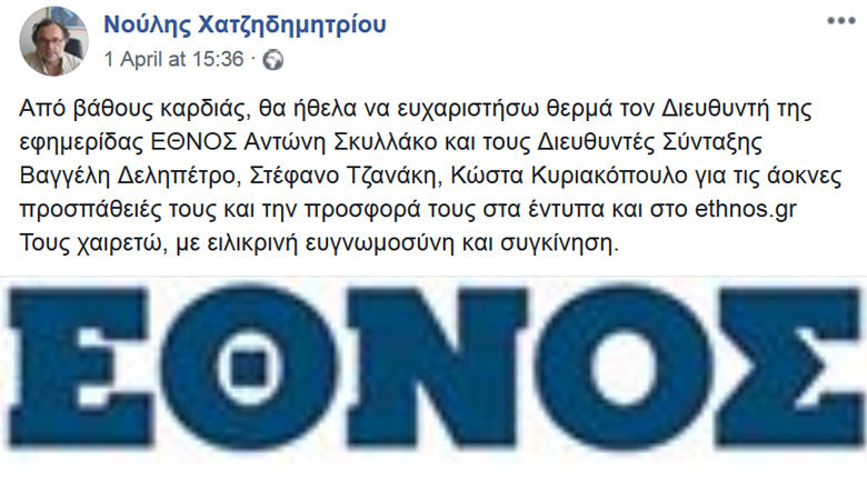 «Από βάθους καρδιάς, θα ήθελα να ευχαριστήσω θερμά τον Διευθυντή της εφημερίδας ΕΘΝΟΣ Αντώνη Σκυλλάκο και τους Διευθυντές Σύνταξης Βαγγέλη Δεληπέτρο, Στέφανο Τζανάκη, Κώστα Κυριακόπουλο για τις άοκνες προσπάθειές τους και την προσφορά τους στα έντυπα και στο ethnos.gr. Τους χαιρετώ, με ειλικρινή ευγνωμοσύνη και συγκίνηση» είχε γράψει στον προσωπικό του λογαριασμό στο facebook.
