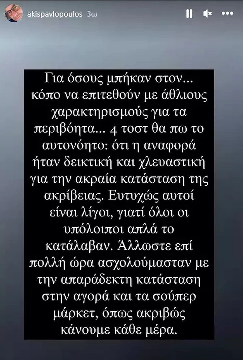 «Άλλωστε επί πολλή ώρα ασχολούμασταν με την απαράδεκτη κατάσταση στην αγορά και τα σούπερ μάρκετ, όπως ακριβώς κάνουμε κάθε μέρα» καταλήγει ο Άκης Παυλόπουλος στη νέα ιστορία που δημοσίευσε, τη νύχτα της Κυριακής, στον λογαριασμό του στο Instagram.