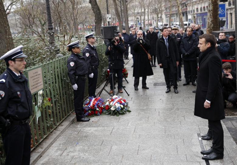 Έγινε η αποκάλυψη πλάκας με τα ονόματα των 11 εργαζομένων στο περιοδικό Charlie Hebdo, κατάθεση στεφάνων από τον υπουργό Εσωτερικών, από τους εβραϊκούς θεσμούς της Γαλλίας, από τους σημερινούς εργαζόμενους στο Charlie Hebdo και από τον πρόεδρο Εμανουέλ Μακρόν μαζί με τη Δήμαρχο Αν Ινταλγκό.