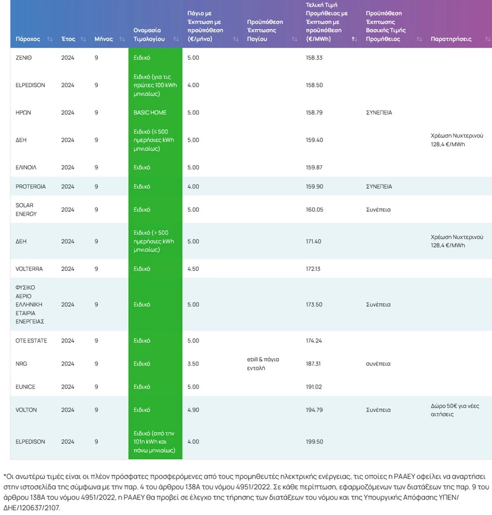 Το πράσινο τιμολόγιο της ΔΕΗ που είναι ο μεγαλύτερος προμηθευτής είναι 15,94 σεντς ανά κιλοβατώρα (από 16,39 τον Αύγουστο) για κατανάλωση έως 500 κιλοβατώρες το μήνα και 17,14 σεντς (από 16,95 τον Αύγουστο) για την υπερβάλλουσα κατανάλωση.
