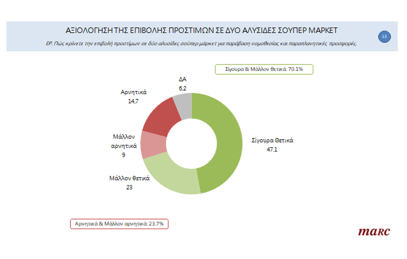 Συγκεκριμένα, σύμφωνα με δημοσκόπηση της εταιρείας Marc για την εφημερίδα Real News, οι ερωτηθέντες δηλώνουν σύμφωνοι με τα πρόστιμα που επέβαλε η ΔΙΜΕΑ σε δύο σούπερ μάρκετ για παραβίαση του πλαφόν κέρδους -όπως ίσχυε μέχρι τον περασμένο Ιούνιο- και του κώδικα δεοντολογίας που έχει τεθεί σε ισχύ από την Άνοιξη.
