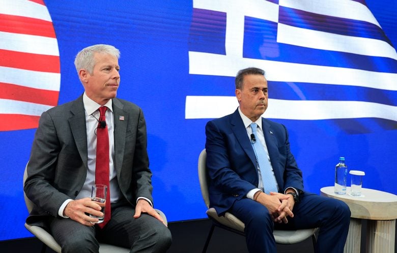 Η νέα πρέσβης των ΗΠΑ στην Ελλάδα, κ. Κίμπερλι Γκίλφοϊλ, και ο επικεφαλής του Εθνικού Συμβουλίου Ενεργειακής Κυριαρχίας, κ. Νταγκ Μπέργκαμ (δεξιά)