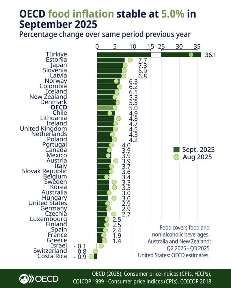 Σύμφωνα με τα τελευταία στοιχεία του ΟΟΣΑ για τον Σεπτέμβριο 2025, ο πληθωρισμός στα τρόφιμα στη χώρα μας διαμορφώθηκε στο 1,4%, έναντι 3,5% στον μέσο όρο της ΕΕ και 5% στις χώρες του ΟΟΣΑ. Αυτό τοποθετεί την Ελλάδα στη χαμηλότερη θέση στην ΕΕ και στην τέταρτη χαμηλότερη θέση ανάμεσα στις 38 χώρες-μέλη του ΟΟΣΑ.