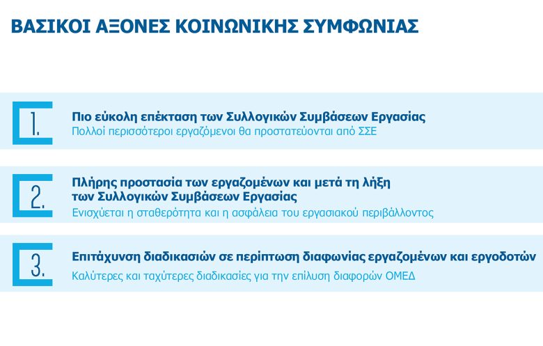 Όπως αναφέρθηκε, η κοινωνική συμφωνία συνεπάγεται πολλαπλά οφέλη για εργαζόμενους και επιχειρήσεις, καθώς οδηγεί στη σύναψη και επέκταση περισσότερων Συλλογικών Συμβάσεων Εργασίας, δημιουργεί ένα ασφαλές και προβλέψιμο εργασιακό περιβάλλον, προστατεύει πλήρως τα δικαιώματα των εργαζομένων ακόμα και μετά τη λήξη Συλλογικής Σύμβασης Εργασίας, προστατεύει τους νεοπροσλαμβανόμενους, δημιουργεί τις προϋποθέσεις για περαιτέρω αύξηση μισθών και παροχών, ενισχύει τον υγιή ανταγωνισμό και διασφαλίζει τη νομιμότητα με σαφή προσδιορισμό του πεδίου εφαρμογής των Συλλογικών Συμβάσεων Εργασίας και κατά την επέκτασή τους.
