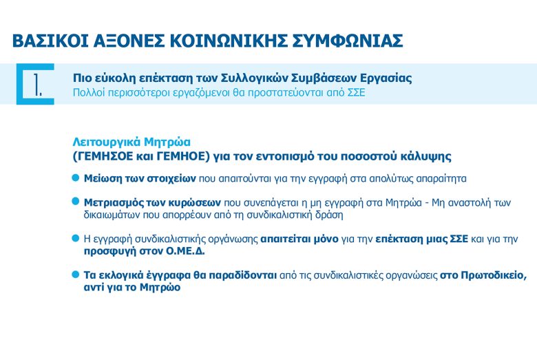 Ο πρώτος άξονας αφορά τη διευκόλυνση που παρέχεται στην επέκταση των Συλλογικών Συμβάσεων Εργασίας, ώστε πολλοί περισσότεροι εργαζόμενοι να προστατεύονται από Συλλογικές Συμβάσεις Εργασίας.