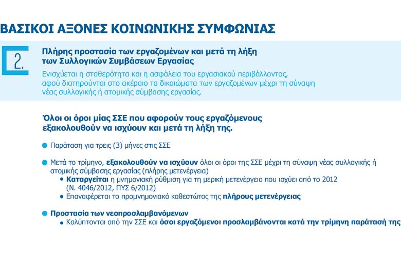 Ο δεύτερος άξονας αφορά στην πλήρη προστασία των εργαζομένων, μετά τη λήξη των Συλλογικών Συμβάσεων Εργασίας. Με τον τρόπο αυτό, ενισχύεται η σταθερότητα και η ασφάλεια του εργασιακού περιβάλλοντος, αφού διατηρούνται στο ακέραιο τα δικαιώματα των εργαζομένων μέχρι τη σύναψη νέας συλλογικής ή ατομικής σύμβασης εργασίας.