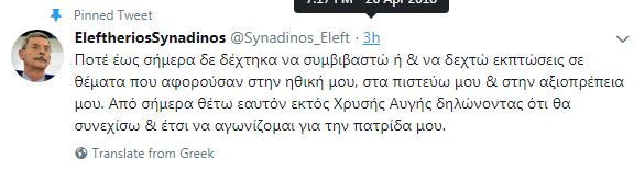 «Ποτέ έως σήμερα δε δέχτηκα να συμβιβαστώ ή και να δεχτώ εκπτώσεις σε θέματα που αφορούσαν στην ηθική μου, στα πιστεύω μου και στην αξιοπρέπεια μου. Από σήμερα θέτω εαυτόν εκτός Χρυσής Αυγής δηλώνοντας ότι θα συνεχίσω και έτσι να αγωνίζομαι για την πατρίδα μου».