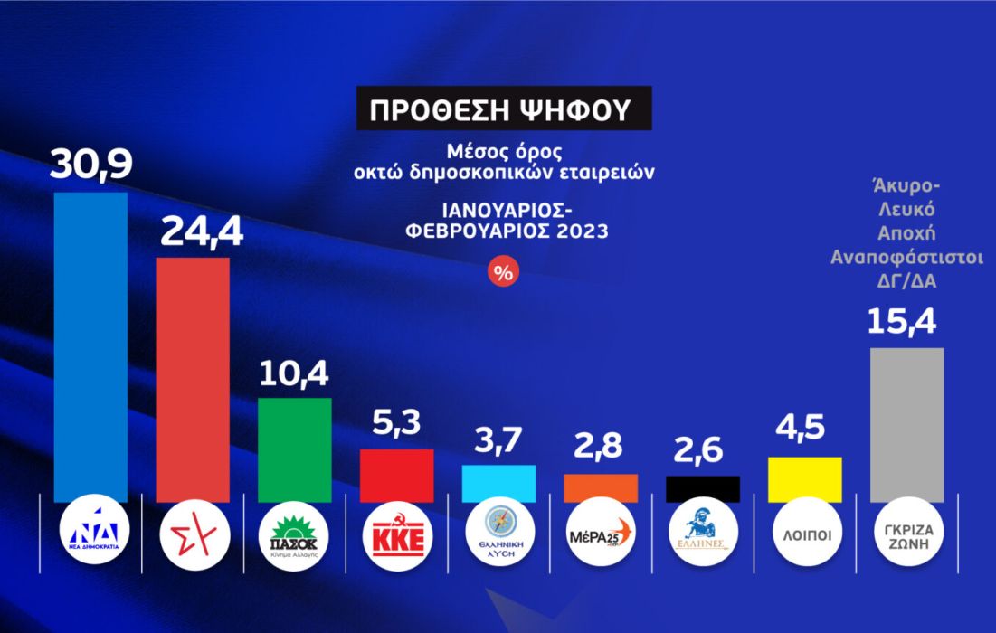 Σύμφωνα με τον μέσο όρο που προκύπτει από τις δημοσκοπήσεις 8 εταιρειών για την περίοδο Ιανουαρίου-Φεβρουαρίου 2023, στην πρόθεση ψήφου η ΝΔ προηγείται με διαφορά 6,5 μονάδων από τον ΣΥΡΙΖΑ (30,9% έναντι 24,4%). Το ΠΑΣΟΚ ακολουθεί στην 3η θέση με 10,4%, μπροστά από το ΚΚΕ (5,3%), την Ελληνική Λύση (3,7%) και το ΜέΡΑ25 (2,8%). To «Εθνικό Κόμμα – Έλληνες» του Ηλία Κασιδιάρη συγκεντρώνει κατά μέσο όρο 2,6%.