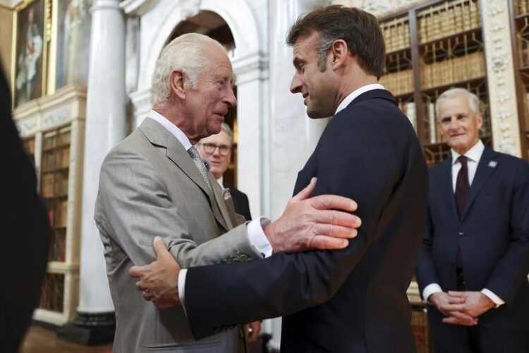 Ο πρόεδρος Μακρόν ήταν από τους πρώτους που χαιρέτησαν τον βασιλιά και έπιασαν ο ένας τον αγκώνα του άλλου με τον πρόεδρο να λέει «σας ευχαριστώ και πάλι για την υπέροχη υποδοχή».