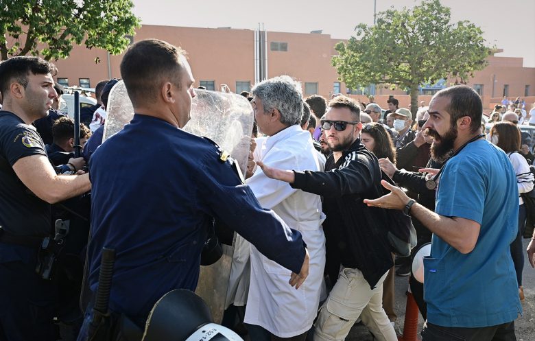 Οι συγκεντρωμένοι κρατούσαν πανό και φώναζαν συνθήματα για τις συνθήκες στα δημόσια νοσοκομεία, ενώ η αστυνομία προσπάθησε να τους απομακρύνει από τον χώρο.